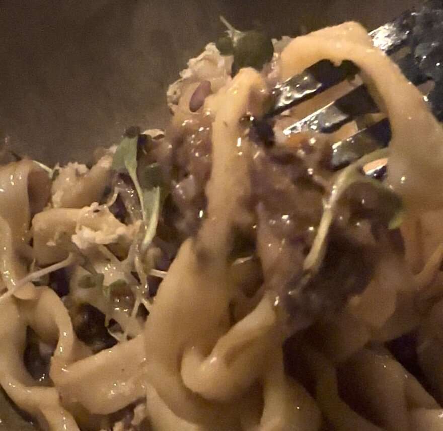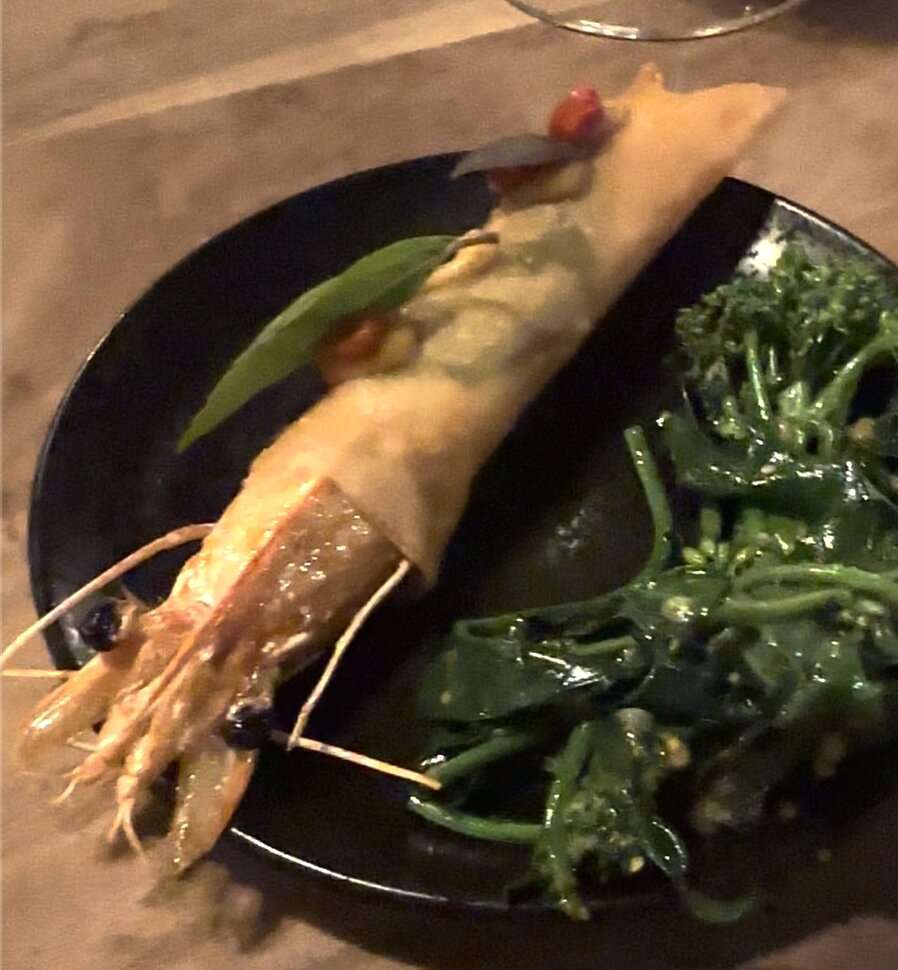 Shrimp Robechon (wonderfully honoring Michel Star Chef Joel Robuchon that I had the pleasure of dining at, in Paris) with pickled gogi berries, dots of the house made hot mustard, Thai basil, wrapped in a spring roll wrapper. “It is crispy and very creative” Stacy says. I add: “As someone who was vegan for some time, it’s hard for me to eat anything with a face on it, but I will say I thoroughly enjoyed this dish”.