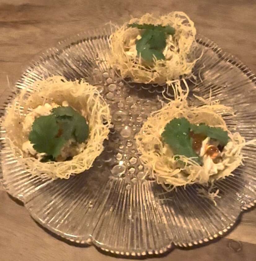 Our first course is the Birds Nest (picture above).“The swordfish is smoky” says Andrew. Stacy adds: “it’s got salmon roe and something very creamy”. Ana says: “Nice texture”. “So light … lighter that vermicelli” adds Stacy.