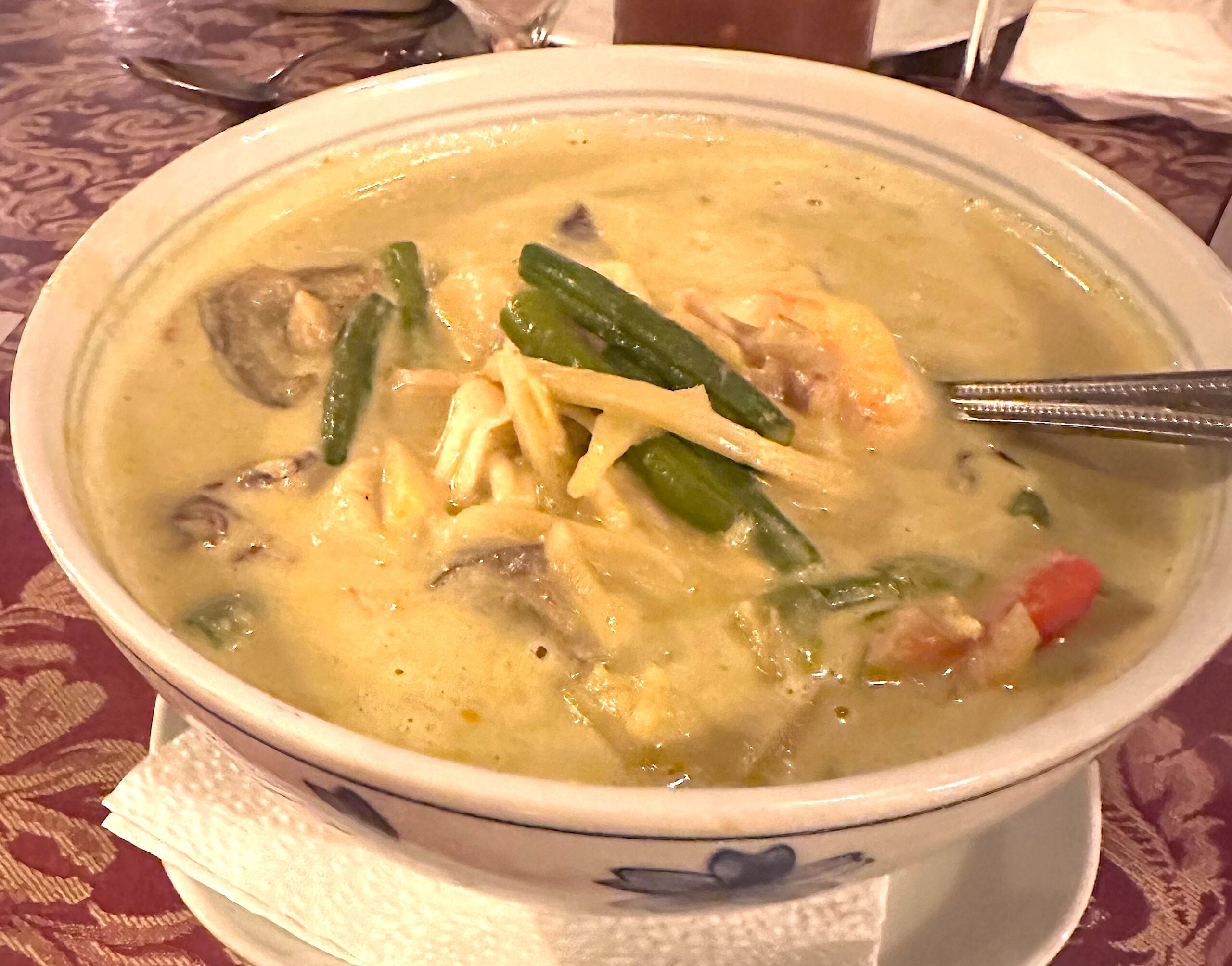 If you want to compare curries, Yellow is mild, creamy with warm spices. Red has medium heat, it’s creamy, savory and balanced. Panang Red is medium heat, thick, rich and nutty. And Green is hot, lighter with fresh herbs.