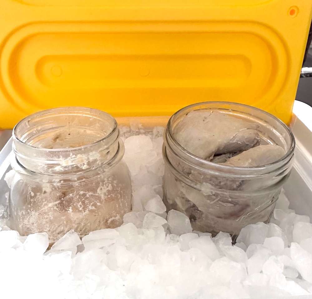 Another way to do this is you can just bring the ice in one large cooler or a few coolers and place 2 -3 ball jars peeking out the top half way, into the ice,