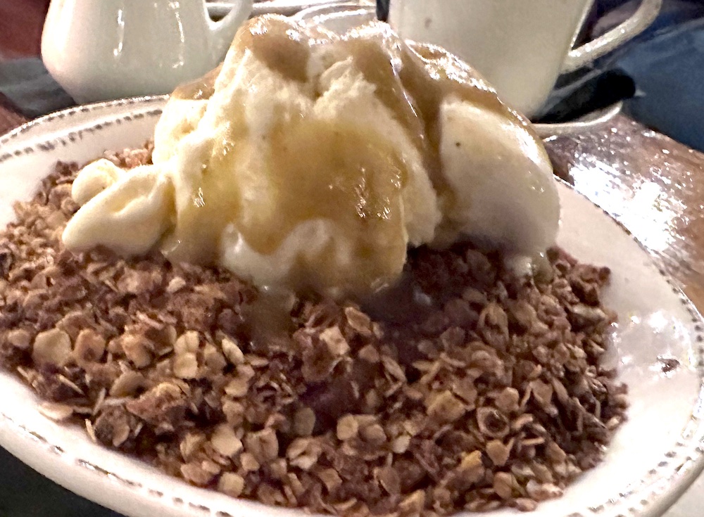 processes them into smaller oats and add the right amount of brown sugar for a granola type topping on these perfectly cut and cooked apple slices and then add vanilla bean ice cream, is just amazing. And it hits all the right spots for me! I have decaf with oat milk. Patsy has real coffee that smells amazing. The man at the next table comments about how good it smells! lol