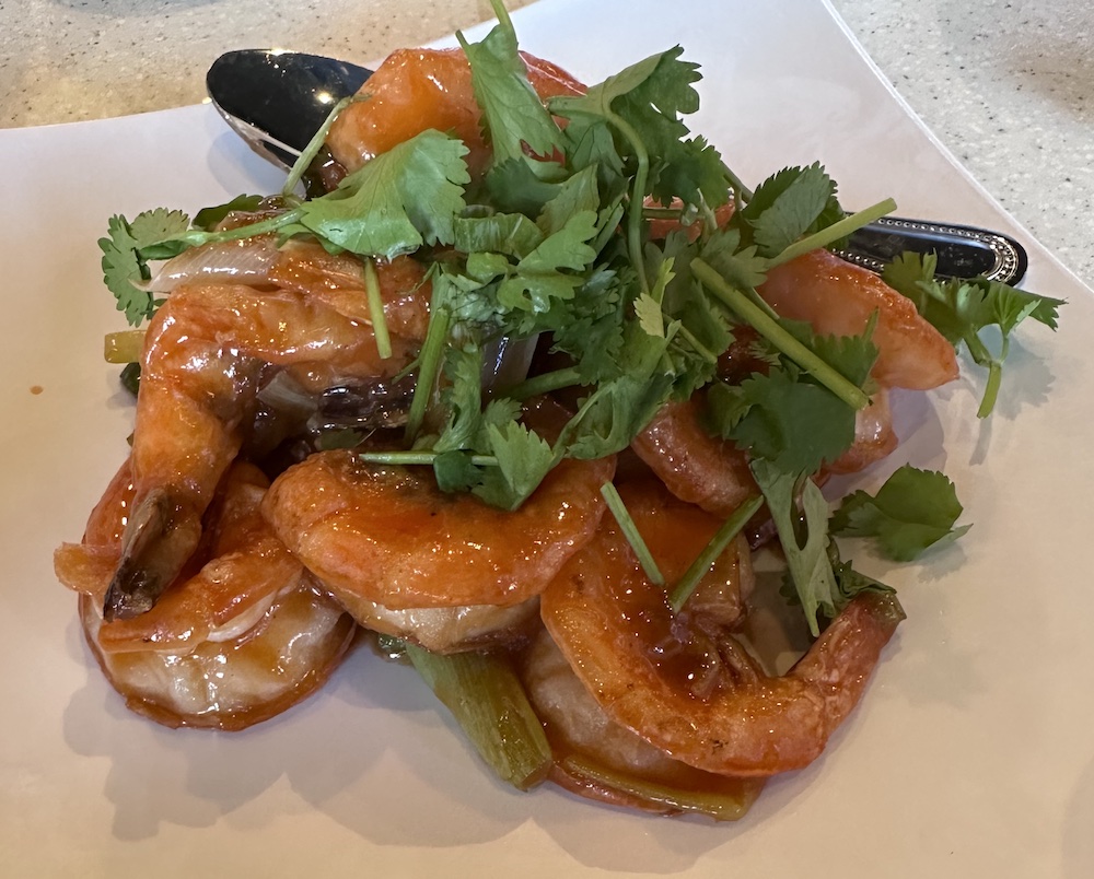 Phyllis says: “I really enjoy the shrimp.” And as I look around the table it becomes obvious that we all feel the same, at least those of us that are not vegan. But there was plenty to eat for all. And the orange sauce is so good, when the shrimp are cooked in their shells, that I find myself sucking on them for the sauce and flavor.