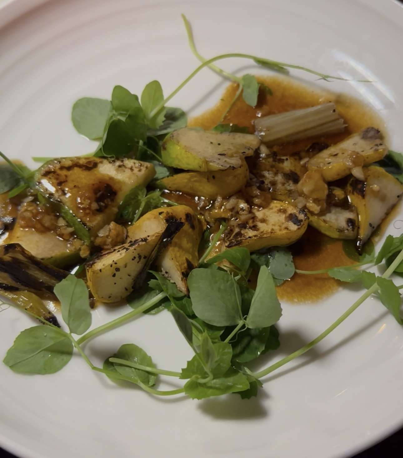 A plate has just been said before me with five vegetarian hand rolls and all of them are unique.The waiter tells us: “Avocado with jalapeño, kale and an onion salad, roasted bell Pepper with a spice plum, roasted squash with an arugula chimichurri and sweet potato with the basil dressing.” And I recommend every single one of them! So good!